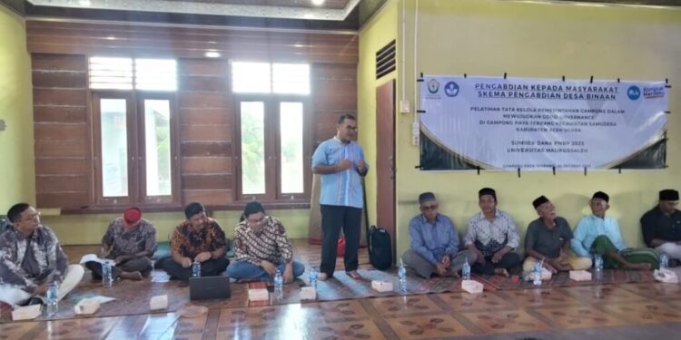 LHOKSUKON- Sejumlah Dosen Ilmu Politik FISIP Unimal mengadakan pelatihan dan dialog interaktif bersama warga Paya Terbang Kecamatan Samudera-Aceh Utara, Senin (30/10/2023). Kegiatan dosen sawee gampong ini dalam rangka pengabdian masyarakat sebagai upaya menjalankan misi Tridarma Perguruan Tinggi Universitas Malikussaleh. Tim dosen ilmu politik dimaksud yaitu; Teuku Muzaffarsyah, Zulhilmi, Taufik Abdullah, Muhammad Abubakar, dan Dahlan A. Rahman.