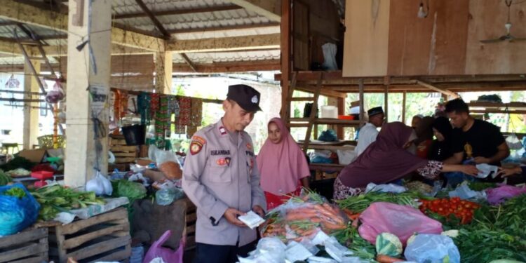 LHOKSEUMAWE – Personel Polsek Nisam menemui pedagang kelontong di pasar Keude Amplah, Kecamatan Nisam, Aceh Utara, wilayah hukum Polres Lhokseumawe, kegiatan tersebut guna memonitor stok sembako, Sabtu (28/10/2023).