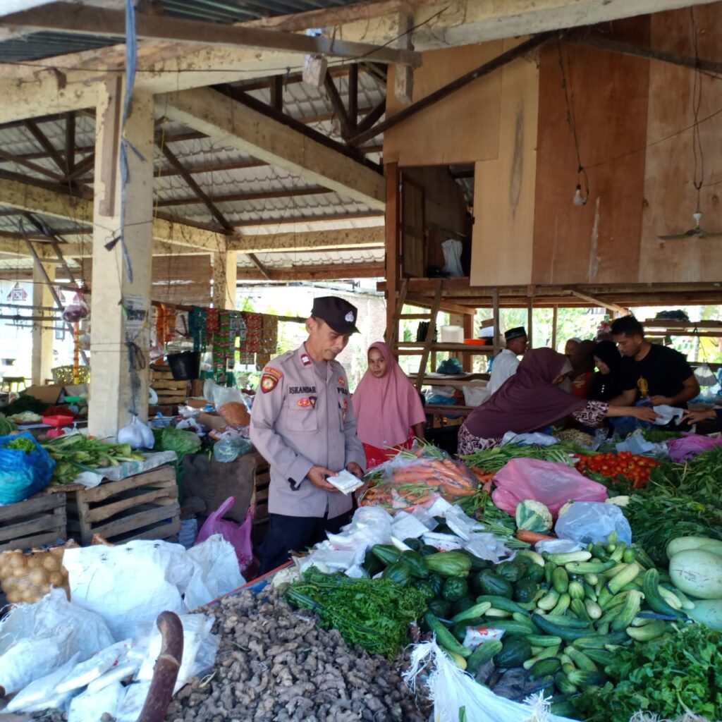 LHOKSEUMAWE – Personel Polsek Nisam menemui pedagang kelontong di pasar Keude Amplah, Kecamatan Nisam, Aceh Utara, wilayah hukum Polres Lhokseumawe, kegiatan tersebut guna memonitor stok sembako, Sabtu (28/10/2023).