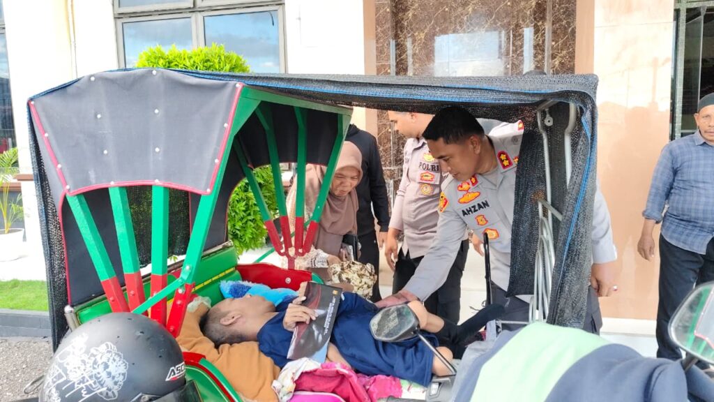 Sebelum berpamitan, Kapolres menanyakan kondisi kesehatan Ramadhan dan memberikan bantuan tambahan sebagai bentuk dukungan dan perhatian kepada keluarga tersebut. Usai berbincang, Kapolres mengantarkan Ramadhan dan keluarganya hingga ke becak yang dikendarai ayahnya dan terparkir di depan lobi Mapolres.