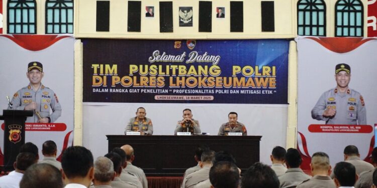Lhokseumawe – Tim dari Pusat Penelitian dan Pengembangan (Puslitbang) Polri menggelar penelitian tentang profesionalitas Polri dan mitigasi etik di Polres Lhokseumawe, selasa (18/3/2025). Kegiatan ini dipimpin langsung oleh Kombes Pol. Ady Savart Penataran Simanjuntak, S.H., S.I.K., selaku ketua tim penelitian, dengan tujuan meningkatkan standar profesionalisme dan etika anggota kepolisian di wilayah hukum Polres Lhokseumawe.