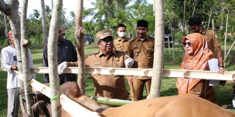 ACEH UTARA — Penjabat Bupati Aceh Utara Mahyuzar meninjau pelaksanaan vaksinasi sapi di Gampong Pulo Rungkom, Kecamatan Dewantara, Senin (25/9/2023). Peninjauan itu dilakukan Mahyuzar sebagai bentuk upaya dukungannya terhadap bisnis peternakan masyarakat.