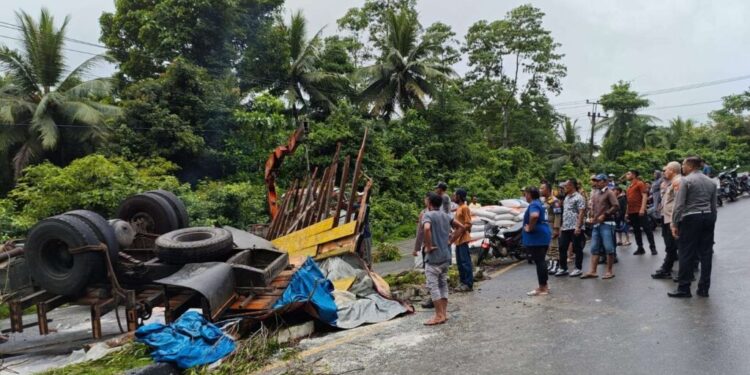 Truk Bermuatan Beras Terguling di Tanjakan Semen