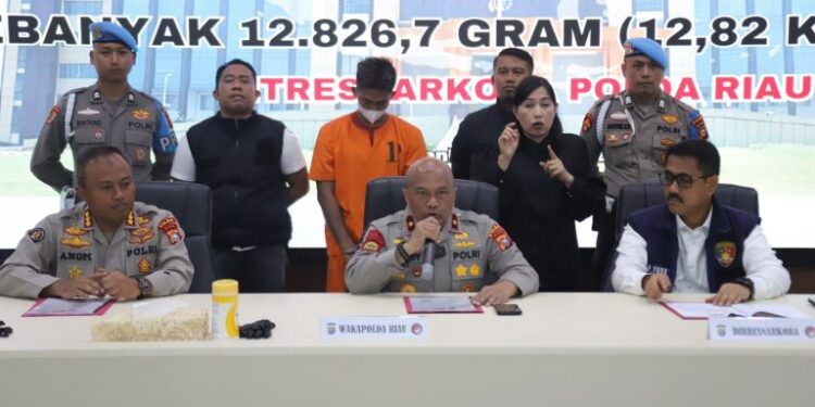 PEKANBARU, – Ditresnarkoba Polda Riau mengelar konferensi pers pengungkapan kasus narkotika jenis sabu jaringan perdagangan narkoba internasional yang melibatkan pengendali dari Malaysia, Senin (28/4/2025).