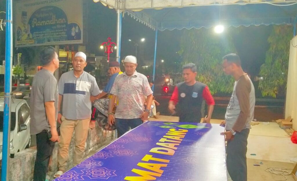 LHOKSEUMAWE – Wakapolres Lhokseumawe, Kompol Dedy Darwinsyah, SE, MM mengecek pembangunan pos pelayanan Operasi Ketupat Seulawah 2023 di depan Masjid Islamic Center Lhokseumawe, Sabtu (15/4/2023) dinihari.