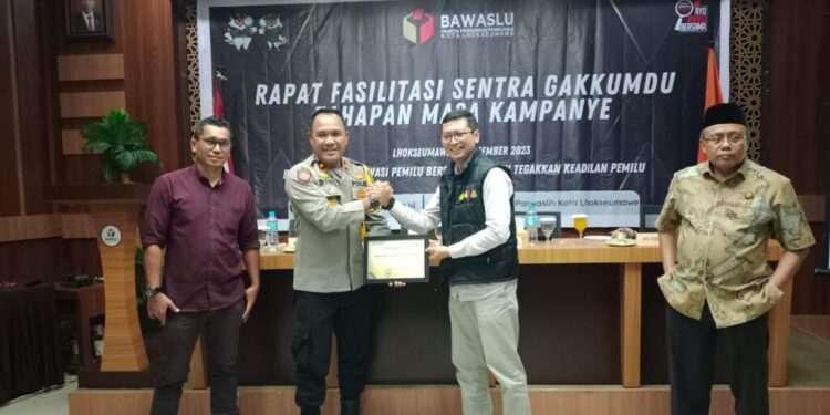 LHOKSEUMAWE – Wakapolres Lhokseumawe, Kompol Dedy Darwinsyah menghadiri rapat fasilitasi sentra penegakan hukum terpadu (Gakkumdu) dengan Bawaslu Kota Lhokseumawe di Hotel Diana,.On Geudong, Kecamatan Banda Sakti, Kota Lhokseumawe, Sabtu (16/12/2023).