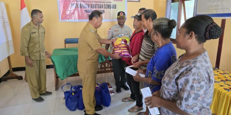 SERUI-Wakil Bupati Kabupaten Kepulauan Yapen bersama PLT Kepala BPBD Yapen Drs Jhon M Moai bersama staf menyerahkan bantuan bahan makanan kepada warga kampung mariadei Pasca banjir yang terjadi 6 Maret 2025.