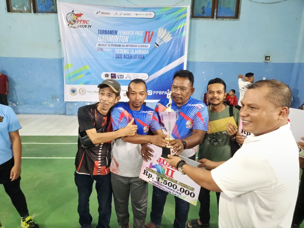 LHOKSEUMAWE – Wakili kapolres, Kasat Binmas Polres Lhokseumawe, Iptu Zahabi menyerahkan piala kepada pemenang turnamen bulu tangkis Pewarta Pase Badminton Club (PPBC) Cup IV di gedung BKPSDM Aceh Utara di Lhokseumawe, Sabtu (28/10/2023) malam.