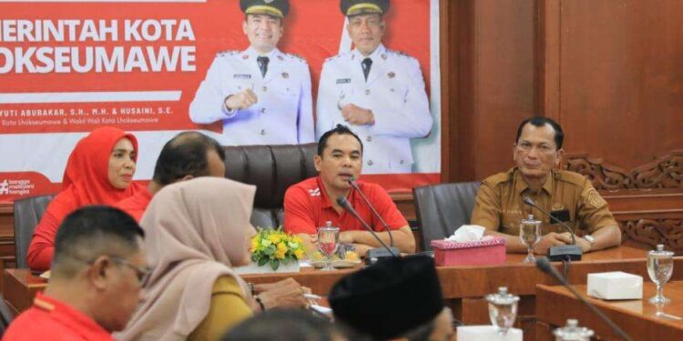 Lhokseumawe – Wali Kota Lhokseumawe, Dr. Sayuti Abubakar, didampingi Sekretaris Daerah A. Haris, memimpin rapat koordinasi bersama para kepala sekolah SMP se-Kota Lhokseumawe di Oproom Kantor Wali Kota Lhokseumawe, Senin (11/8/2025).