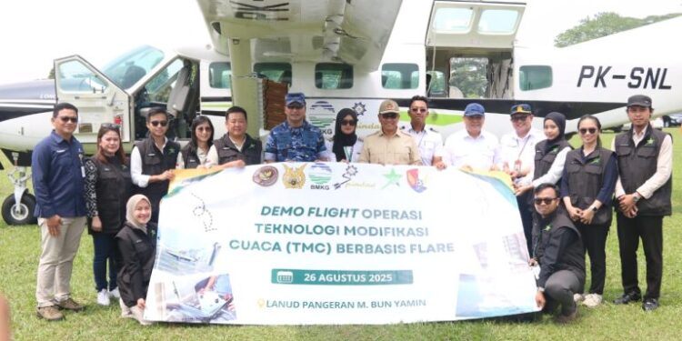 Lampung – Wakil Menteri Pertahanan (Wamenhan) RI yang juga menjabat Sekretaris Dewan Pertahanan Nasional (DPN), Donny Ermawan Taufanto bersama Wakil Menteri ATR/BPN Ossy Dermawan, serta Kepala Staf TNI Angkatan Udara Marsekal TNI M. Tonny Harjono, meninjau langsung kegiatan demonstrasi Teknologi Modifikasi Cuaca (TMC) yang digelar oleh Dewan Pertahanan Nasional (DPN) bersama BMKG, BNPB, BRIN, PT Pindad, TNI AU, dan PT Smart Aviation, di Provinsi Lampung, Selasa (26/8/2025). Setibanya di Bandara Raden Intan dan Lanud Pangeran Mohammad Bun Yamin (BNY) di Menggala, Lampung, disambut oleh Forkopimda Provinsi Lampung dan Forkopimda Kabupaten Tulangbawang.
