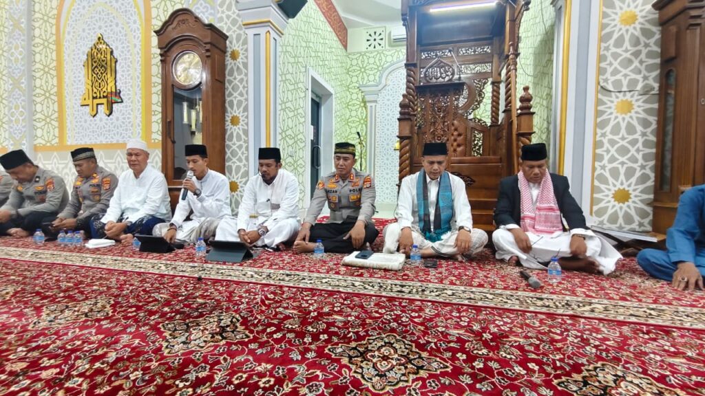 Lhokseumawe – Suasana khidmat menyelimuti Masjid Jamik Desa Lancang Garam, Kecamatan Banda Sakti, Kota Lhokseumawe, Minggu malam (31/8/2025). Sesudah salat Isya, sekitar 60 jamaah bersama tokoh agama dan jajaran kepolisian larut dalam zikir serta doa bersama.